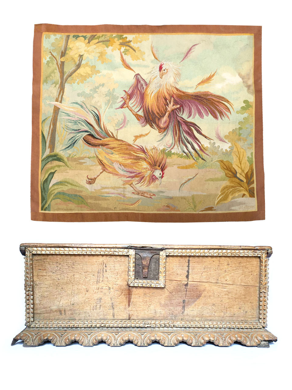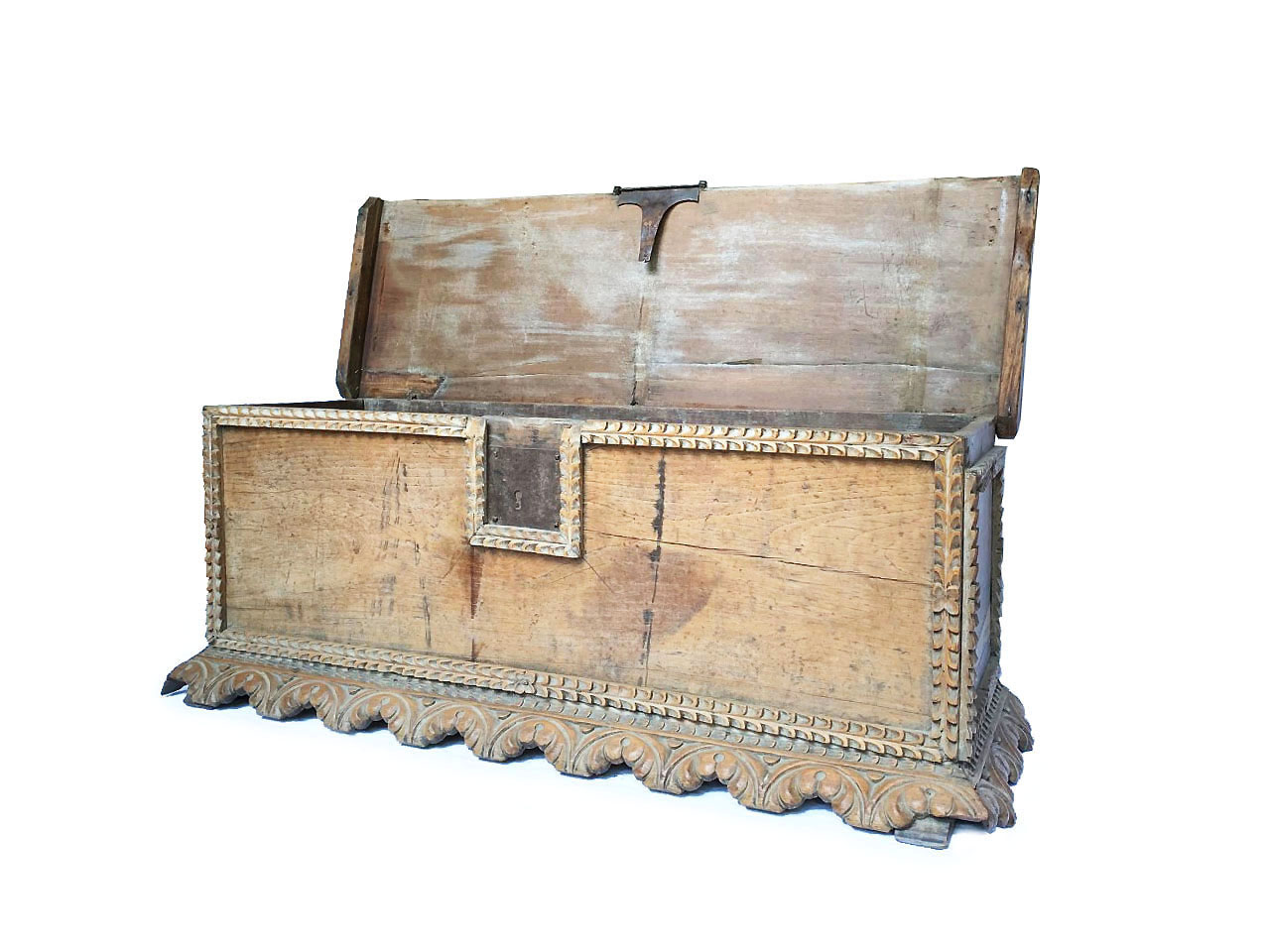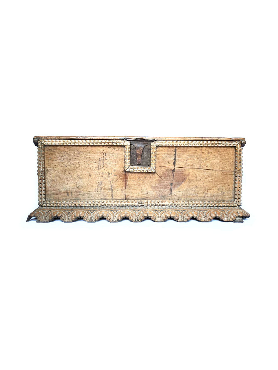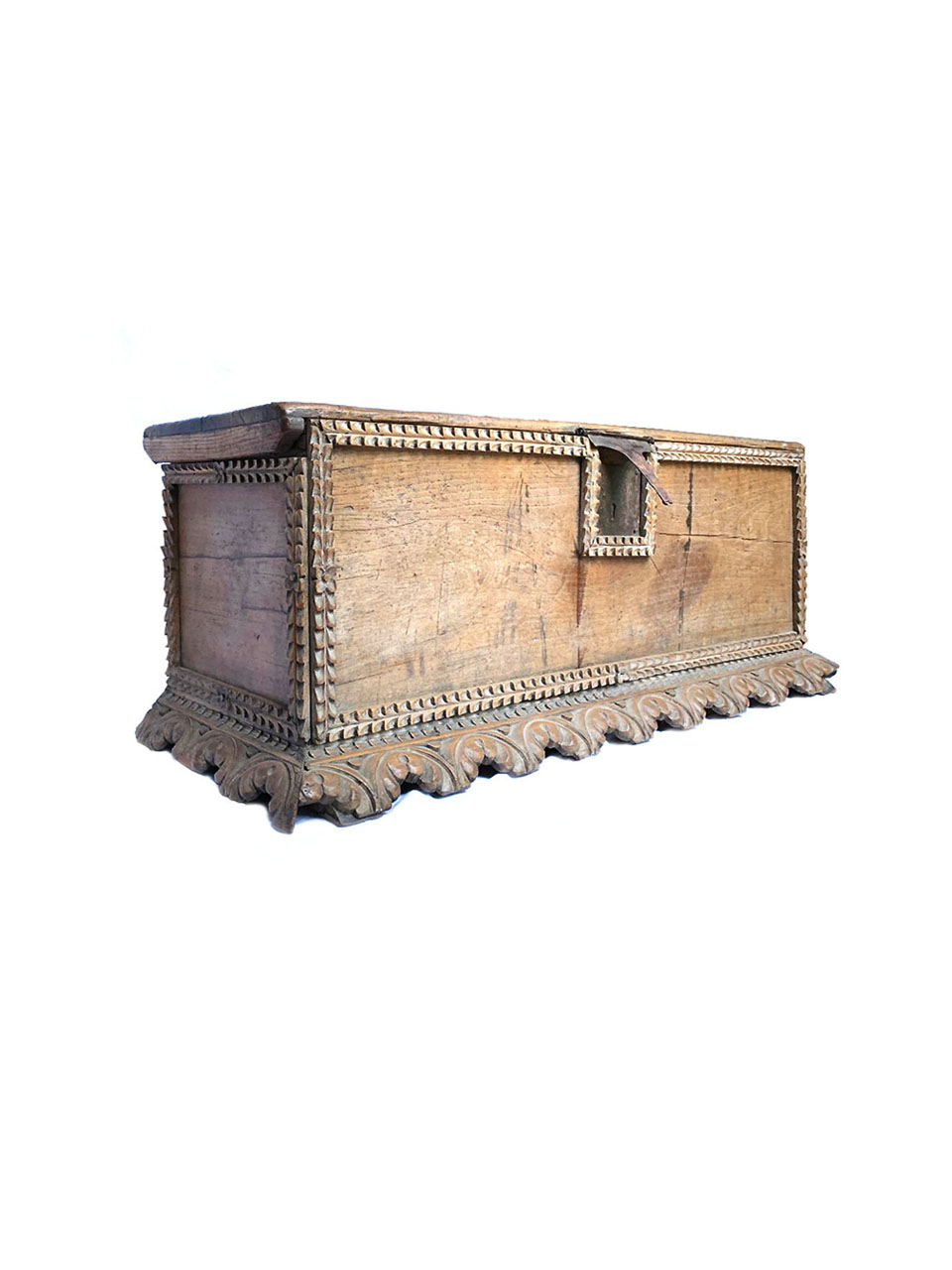 Baú em madeira clara. Caixa retangular, tampa plana com fechadura em ferro batido. Frente e laterais contornadas por frisos, e base ornamentada por saia arqueada e lavrada com entalhes de folhagens.