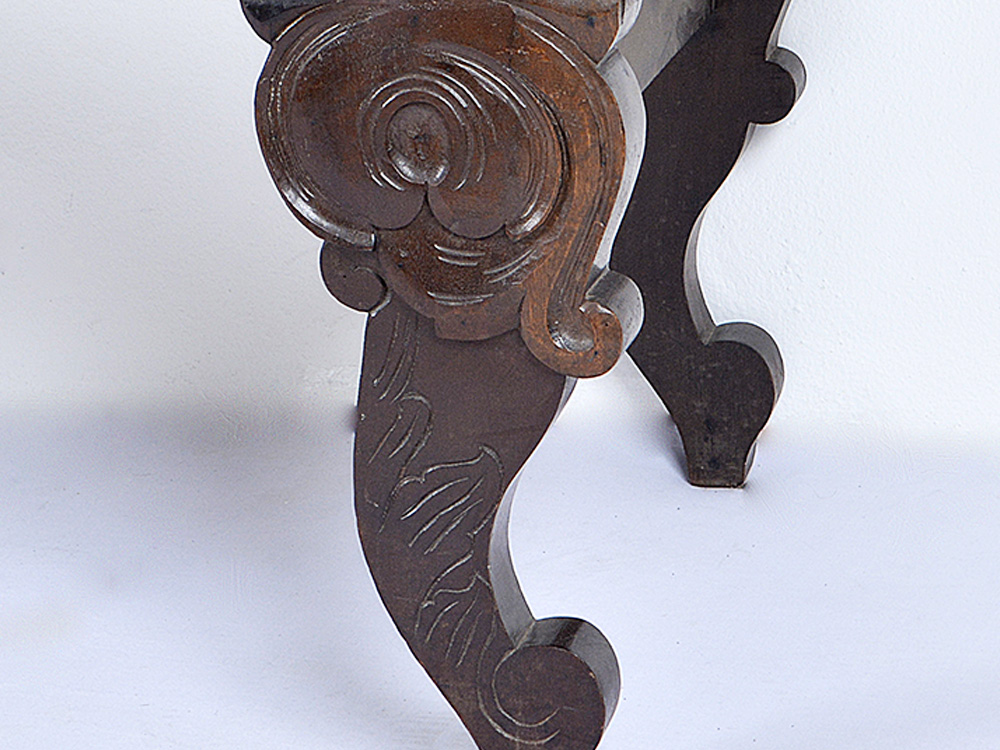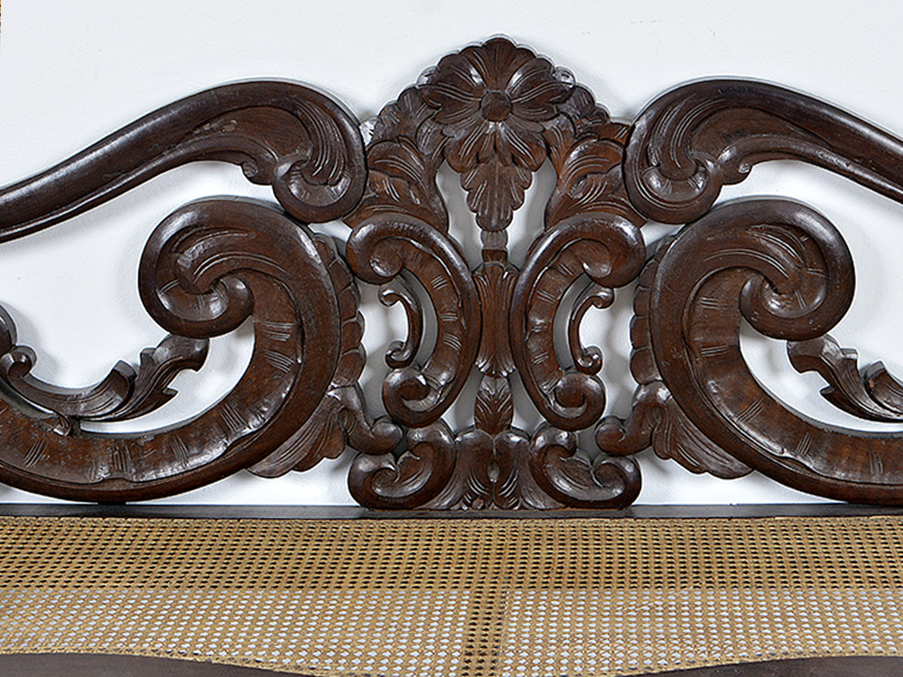 Canapé Beranger em jacarandá. Espaldar ondulado, vazado e entalhado em volutas centralizando flor. Braços revirados para fora. Assento de barra ondulada e entalhada, forrado em palha da Índia. Pés recortados entalhados em volutas e folhagens.