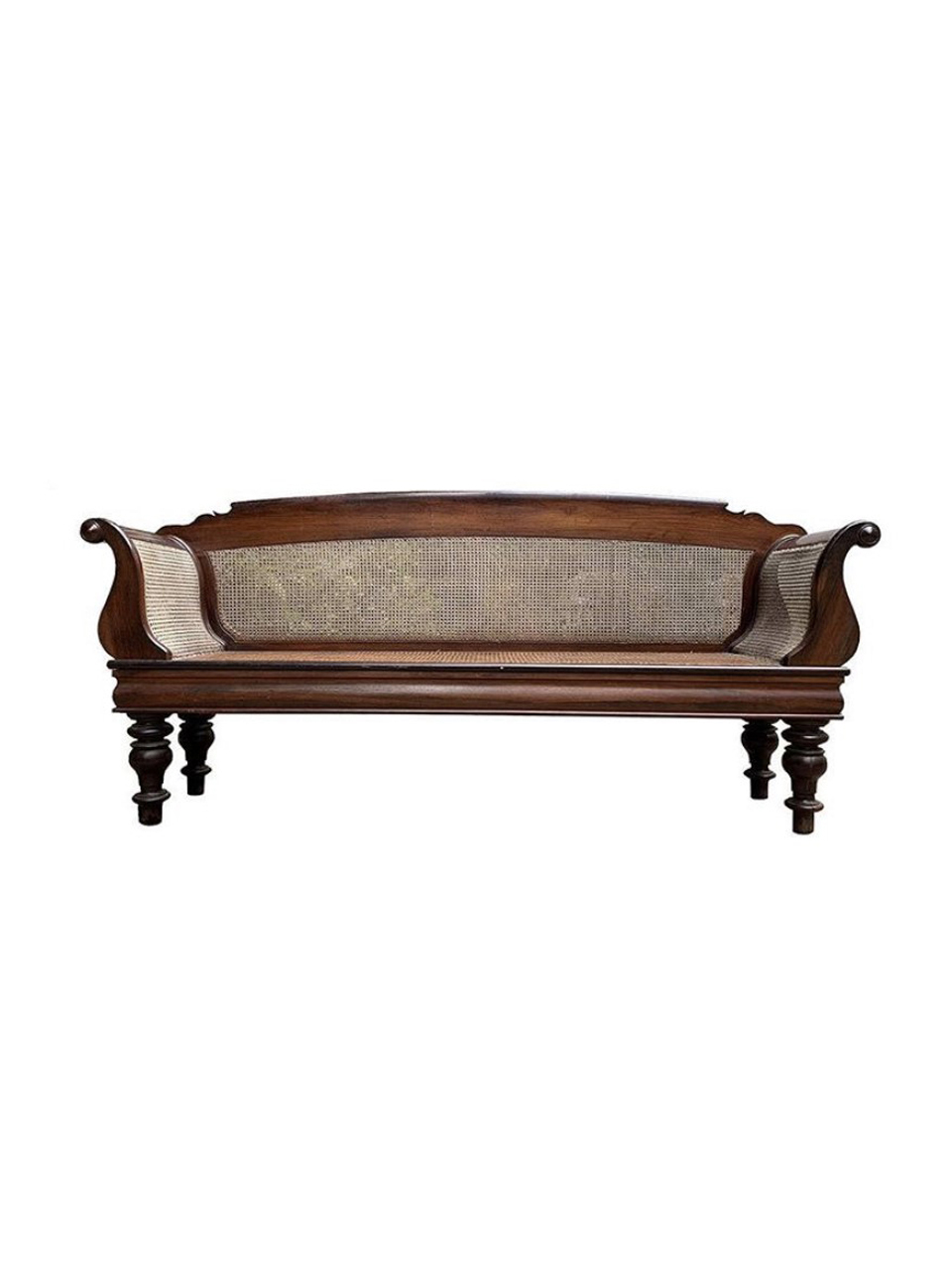 Canapé Império, em jacarandá. Espaldar arqueado, braços revirados para fora, assento retangular sobre barra ondulada. Pés dianteiros e traseiros torneados. Forrações em palha da Índia.