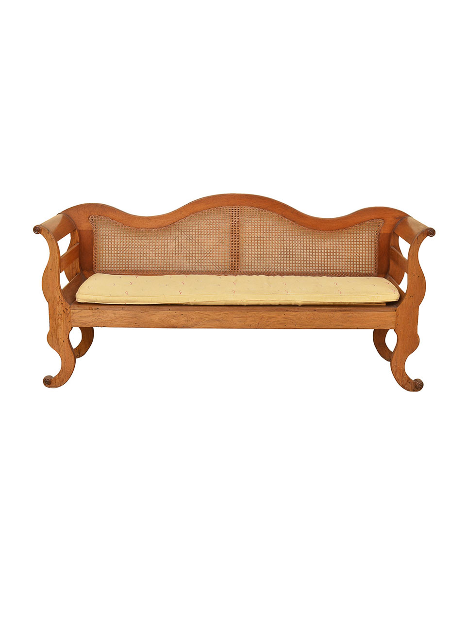 Canapé Império em vinhático. Espaldar ondulado, forrado em palha da Índia. Braços no feitio de “telha”, revirados para fora. Pés arqueados.