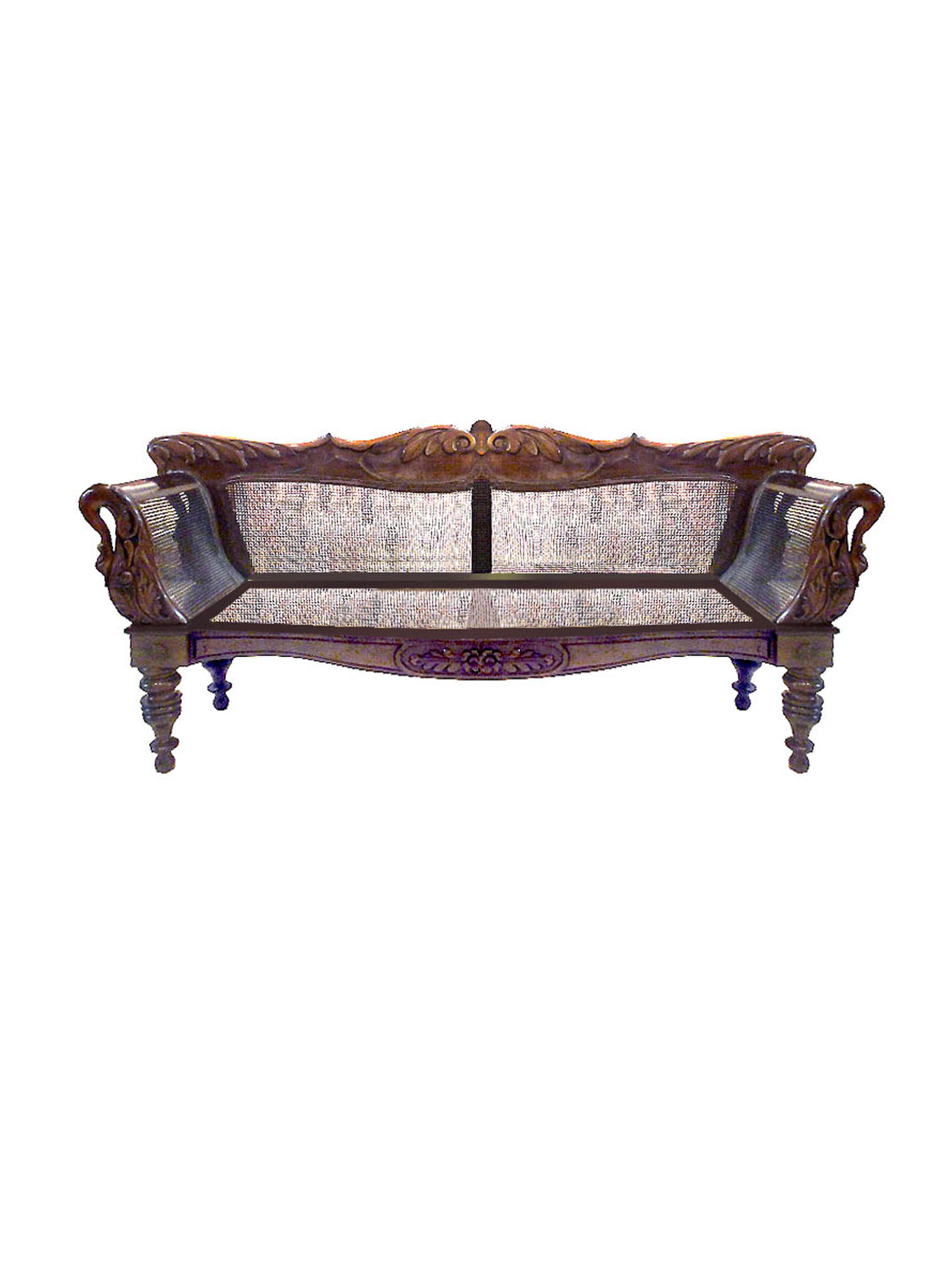 Canapé Império em jacarandá. Espadar movimentado, encimado por grande cachaço entalhado com motivos de folhagens e forração em palha da Índia. Braços ornamentados por cisnes e folhagens, apoios em “telhas” e forração em palha da Índia. Assento em palha da Índia, de barra larga, bombeada e entalhada em folhagens. Pés torneados.