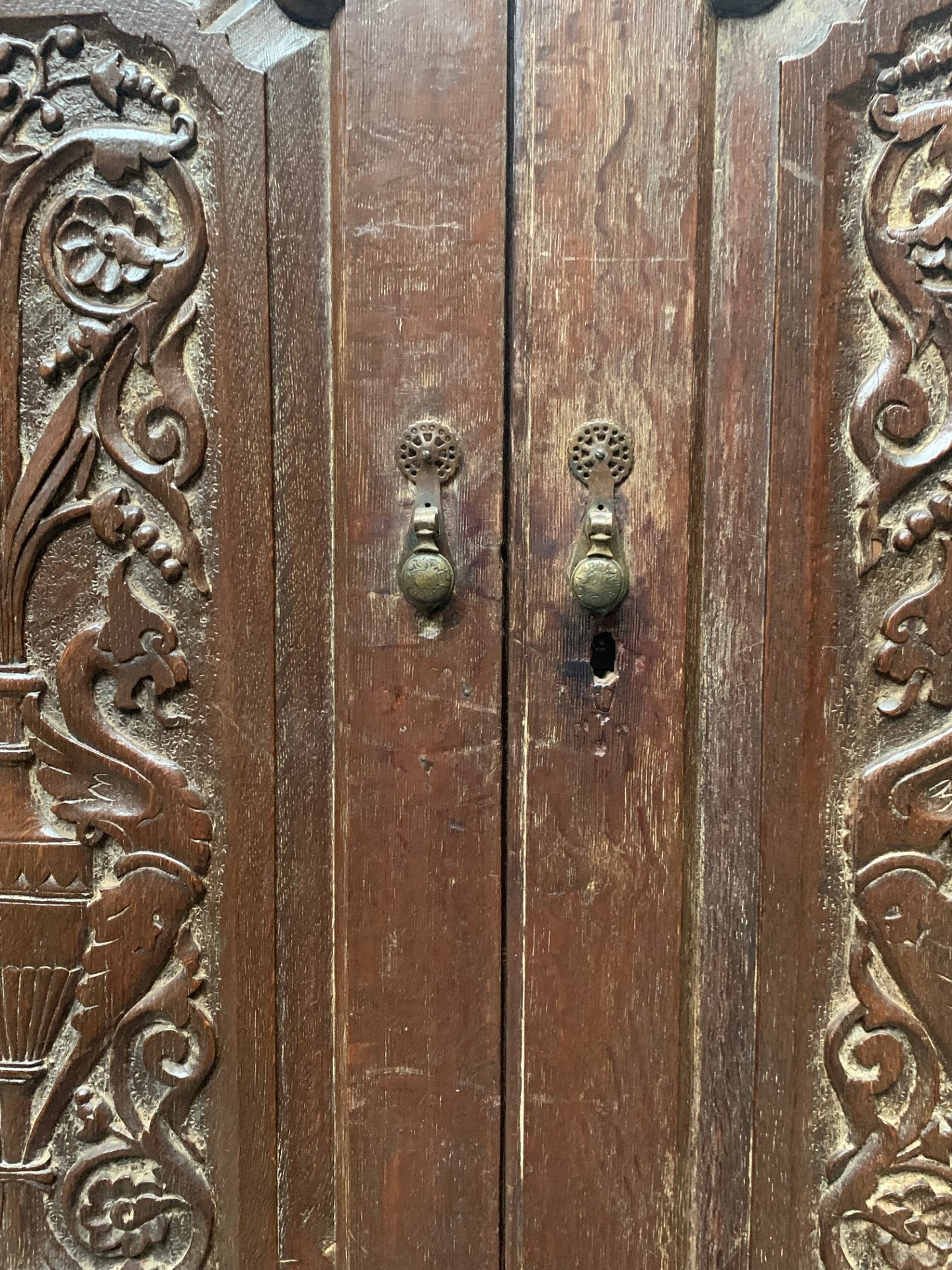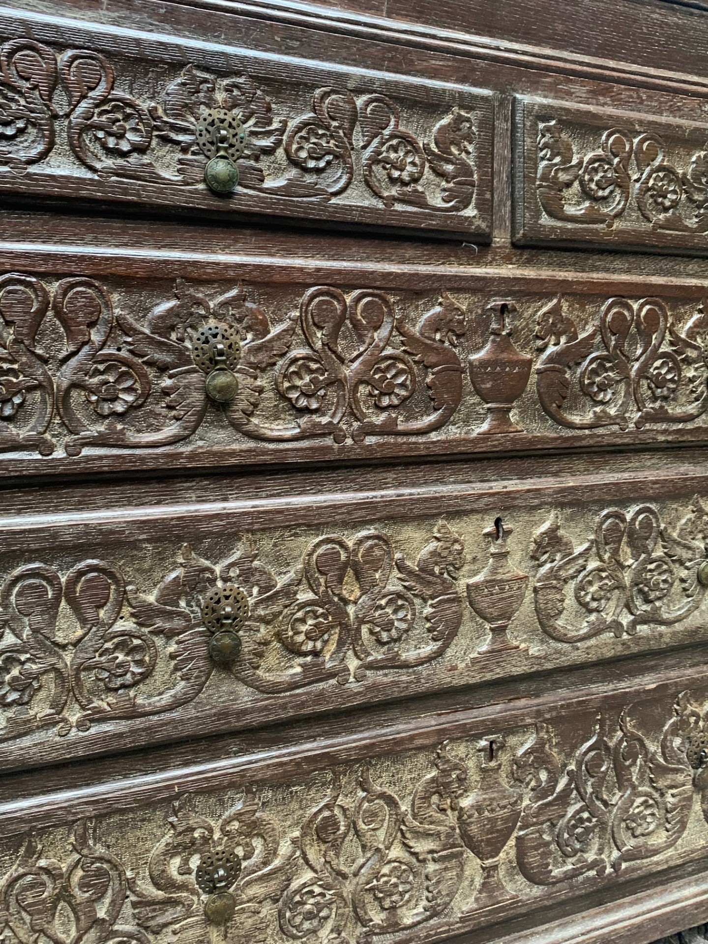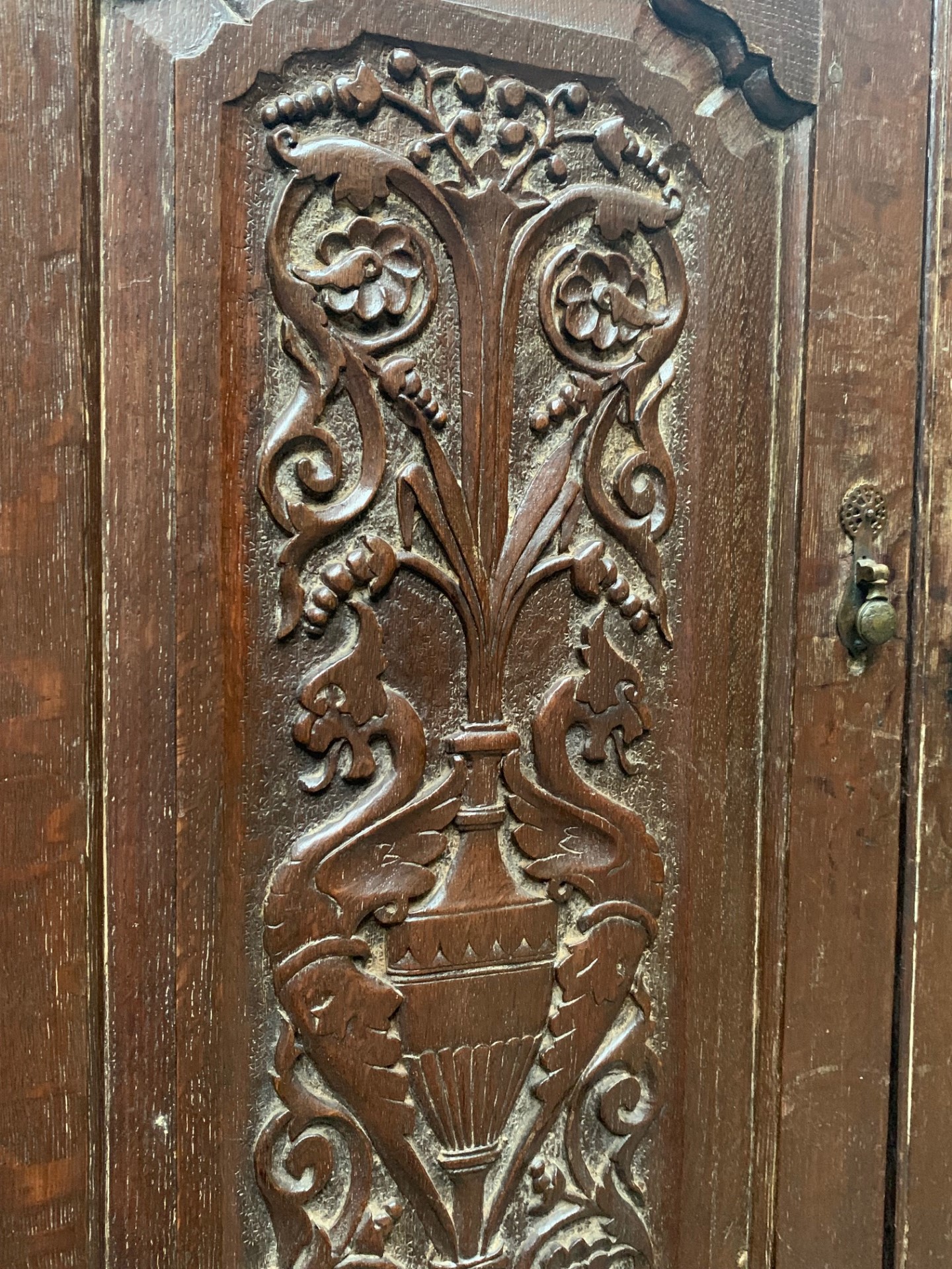 Armário em carvalho. Corpo superior em caixa cimalhada, frente composta por par de portas ornamentadas por painéis com entalhes “grotescos”, jarros ladeados por figuras aladas, volutas, frutos e flores – motivos que recordam as decorações da Roma Antiga. Corpo inferior no feitio de uma cômoda, com par de gavetas alinhadas sobre três gavetões. Ornamentado por entalhes de volutas, flores e animais fantásticos alados, apresenta pés recortados. Puxadores em bronze moldado, do período, e estilo, William and Mary (1689-1702).