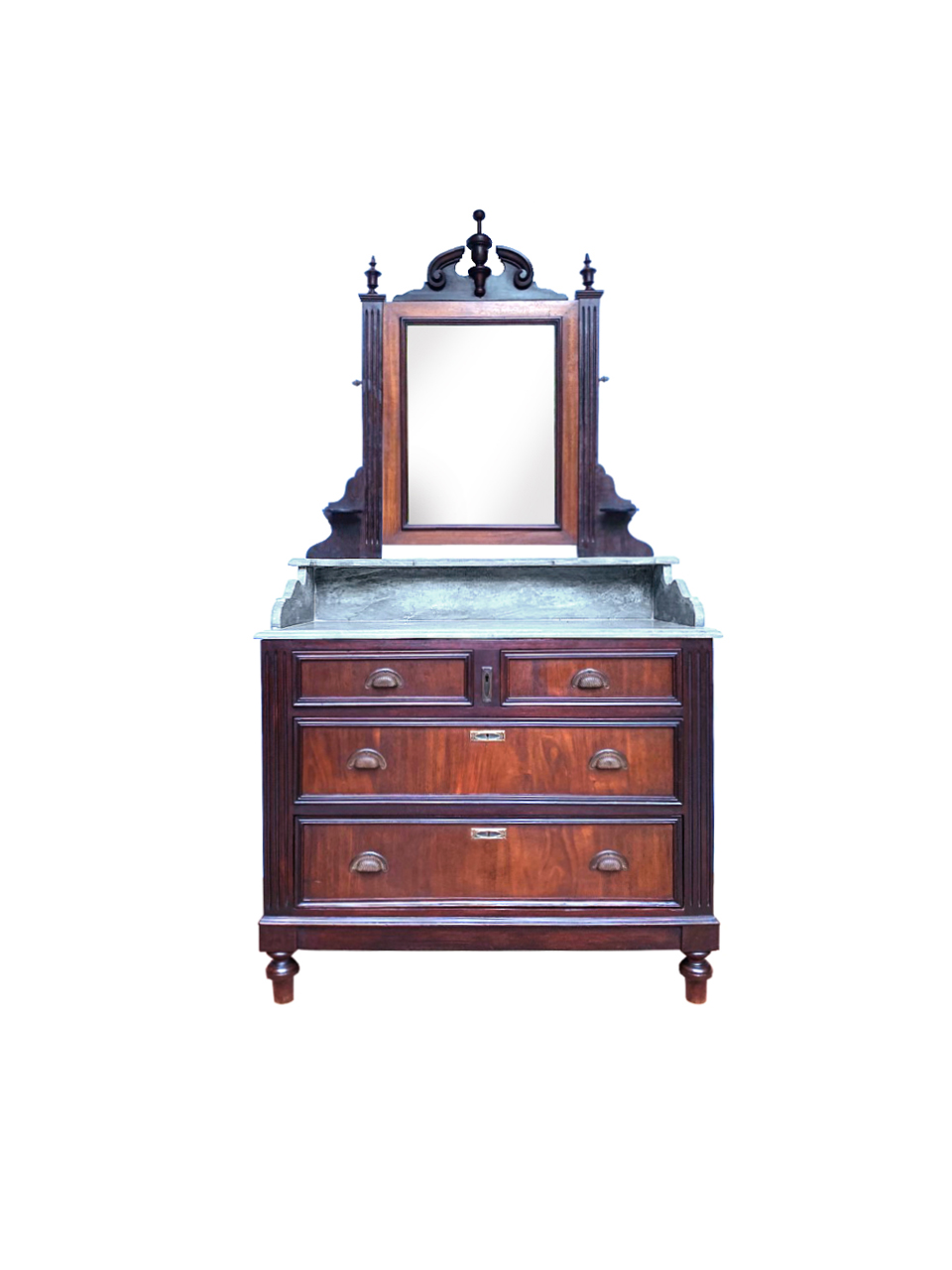 Cômoda lavatório. Caixa reta encimada por tampo em mármore cinza frisado, composto por laterais, fundo e prateleira recuada. Espelho retangular, móvel, com moldura encimada por frontão recortado e centralizado por carrapeta. Montantes frisados e adornados por carrapetas, com peanhas embutidas. Frente da cômoda com par de gavetas e dois gavetões, emoldurados e guarnecidos por puxadores em ferro moldado e espelhos das fechaduras trabalhados. Pés torneados. Não acompanha chaves. Altura somente da cômoda, 83cm. Altura total, 193cm.
