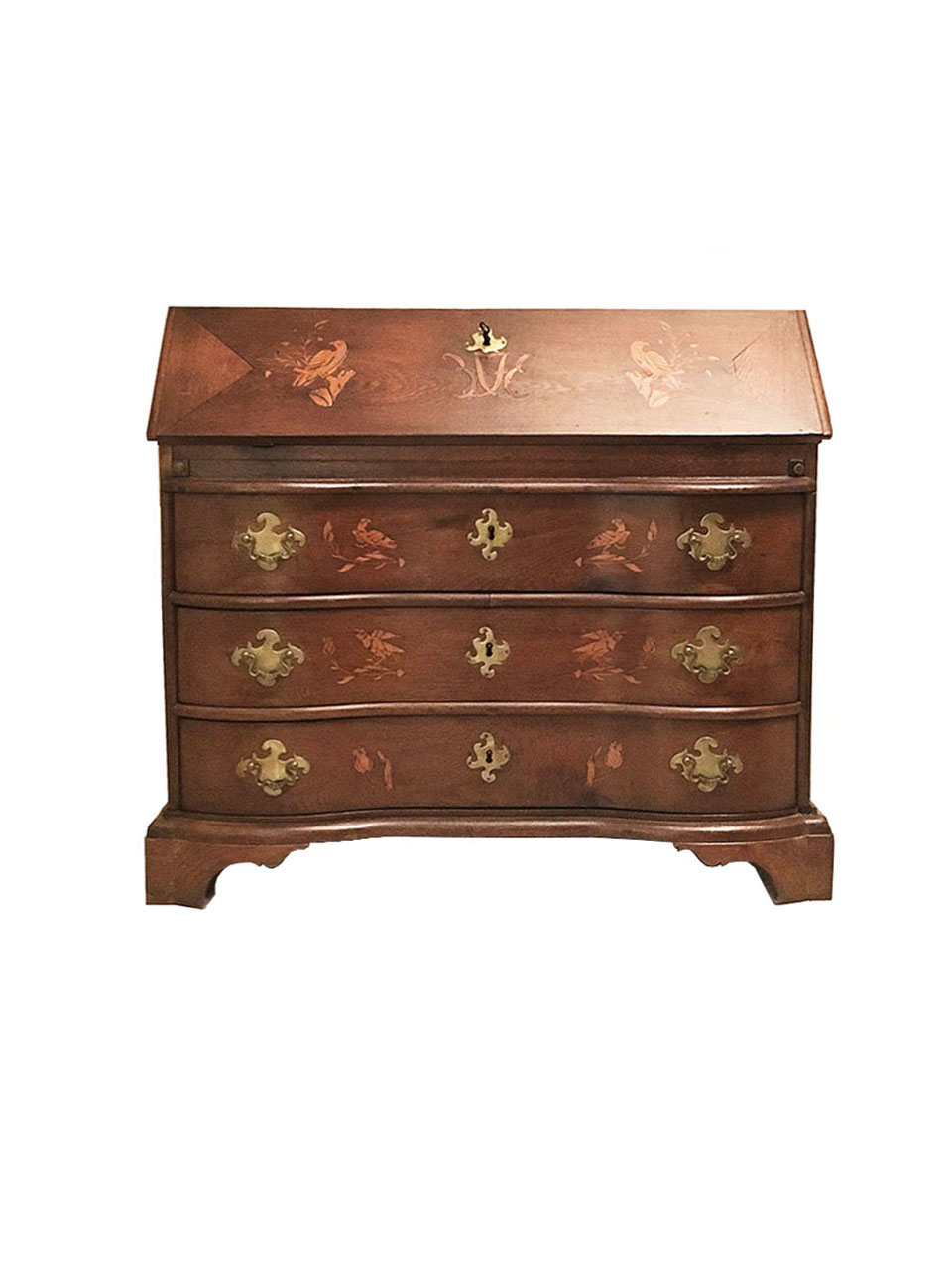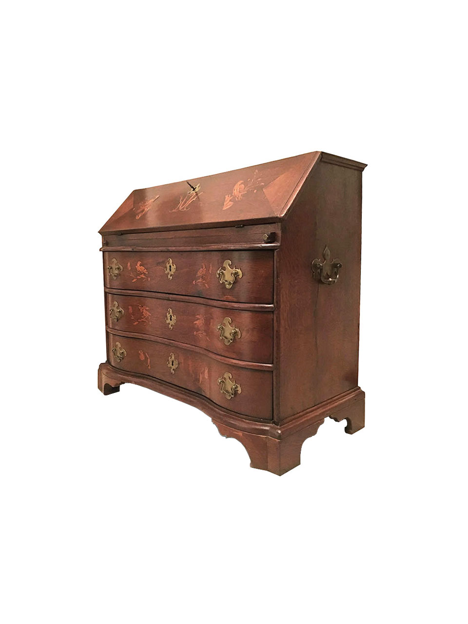 Cômoda papeleira em carvalho. Caixa retangular, com frente ondulada, composta por escritório de tampo “abattant”, interior com gavetinhas, escaninhos e espaço para escrita. Três gavetões sobre pés recortados. Ornamentação composta por marchetaria de pássaros sobre galhos e grandes iniciais sobre a tampa. Puxadores, espelhos das fechaduras, e grandes alças nas laterais da caixa, em bronze polido. Exemplar do mobiliário alemão nobiliárquico.