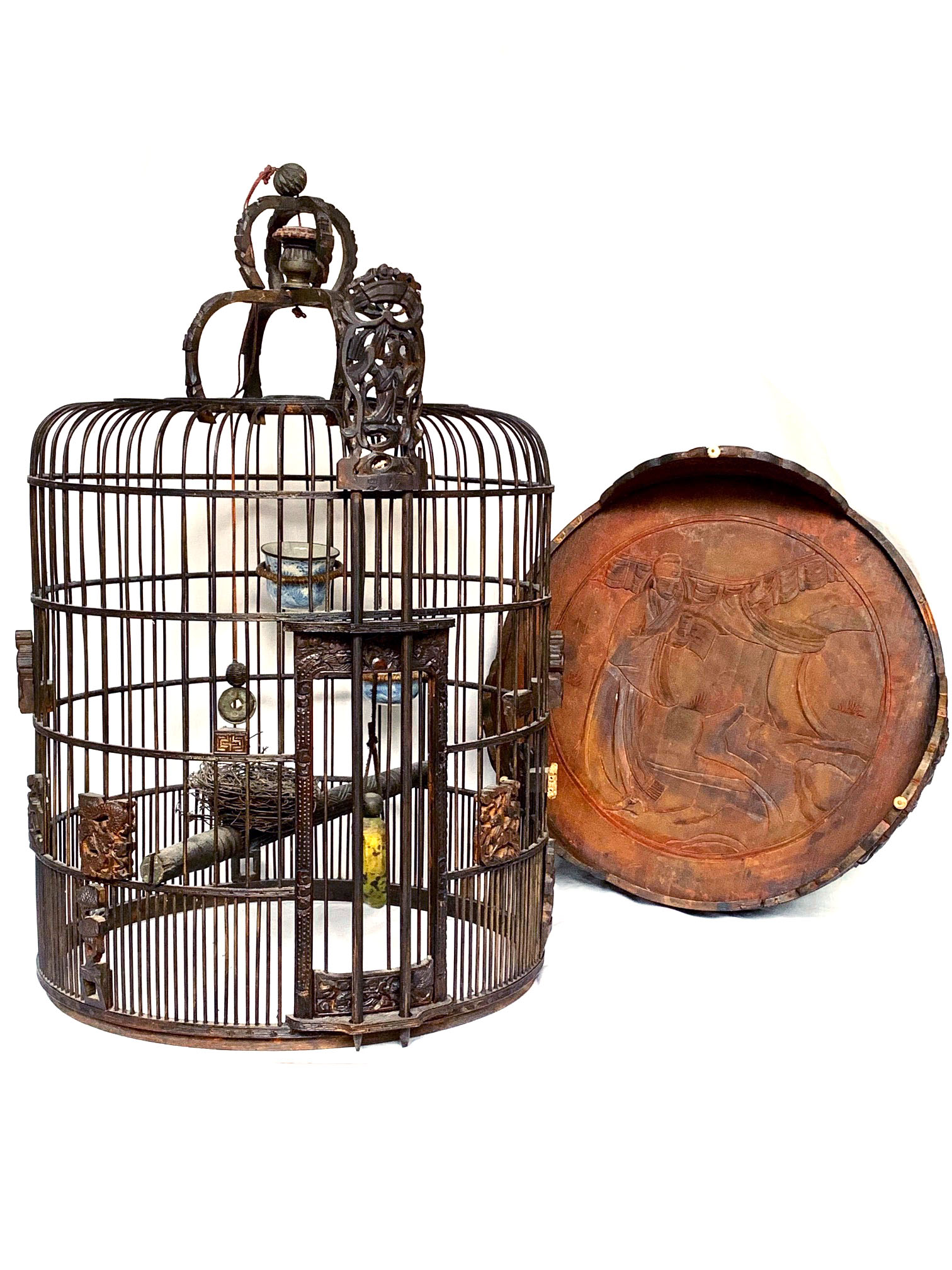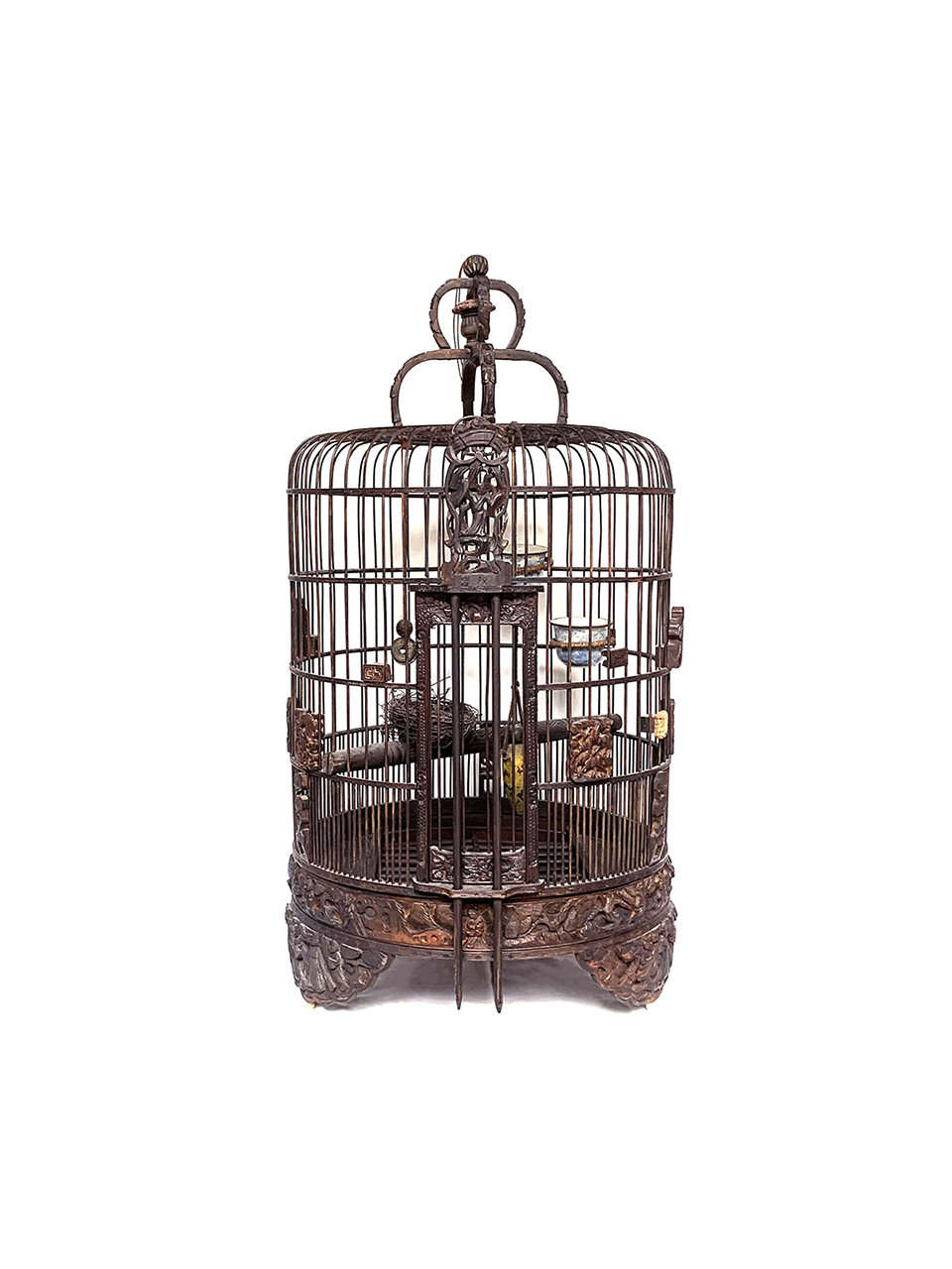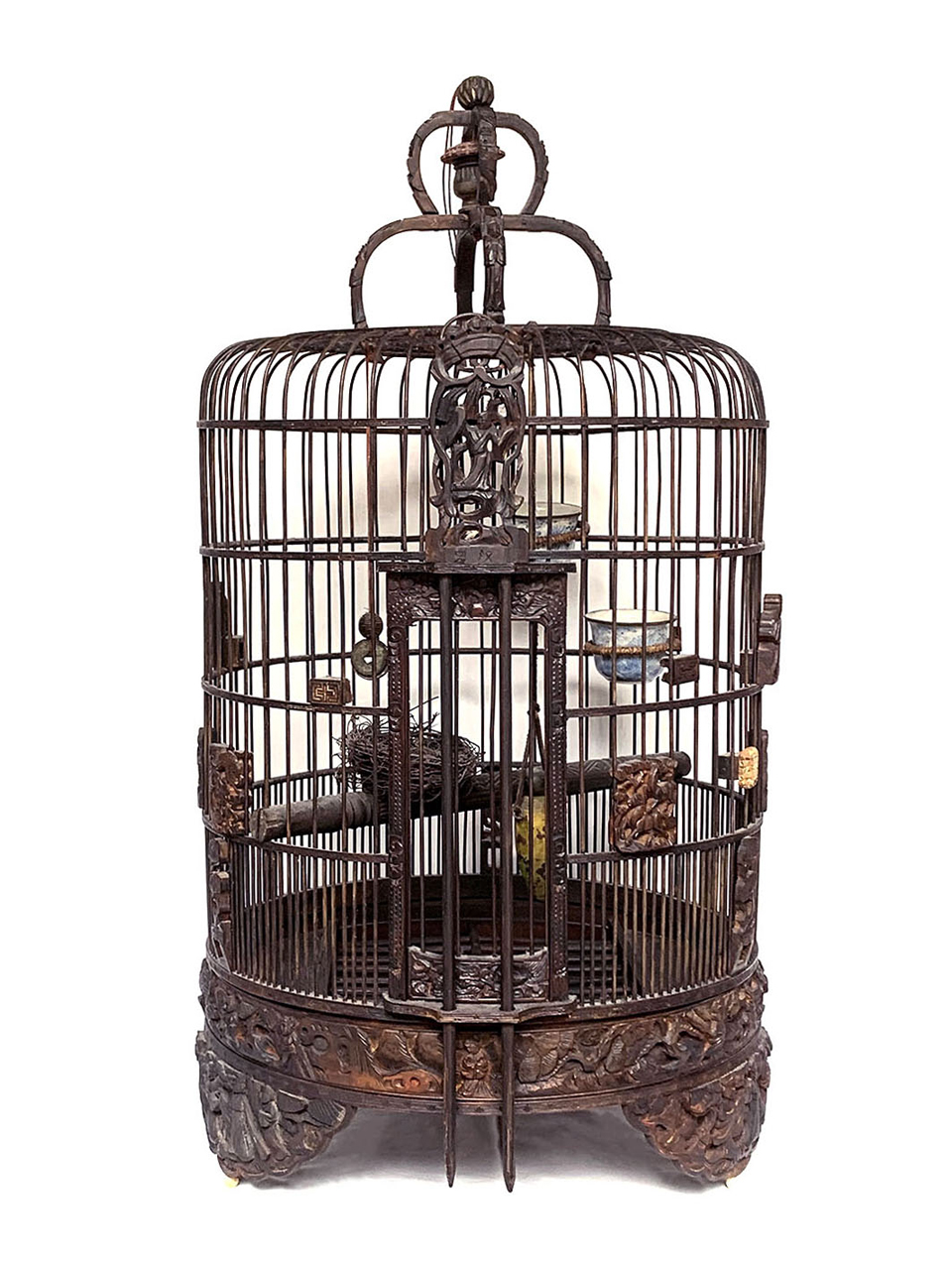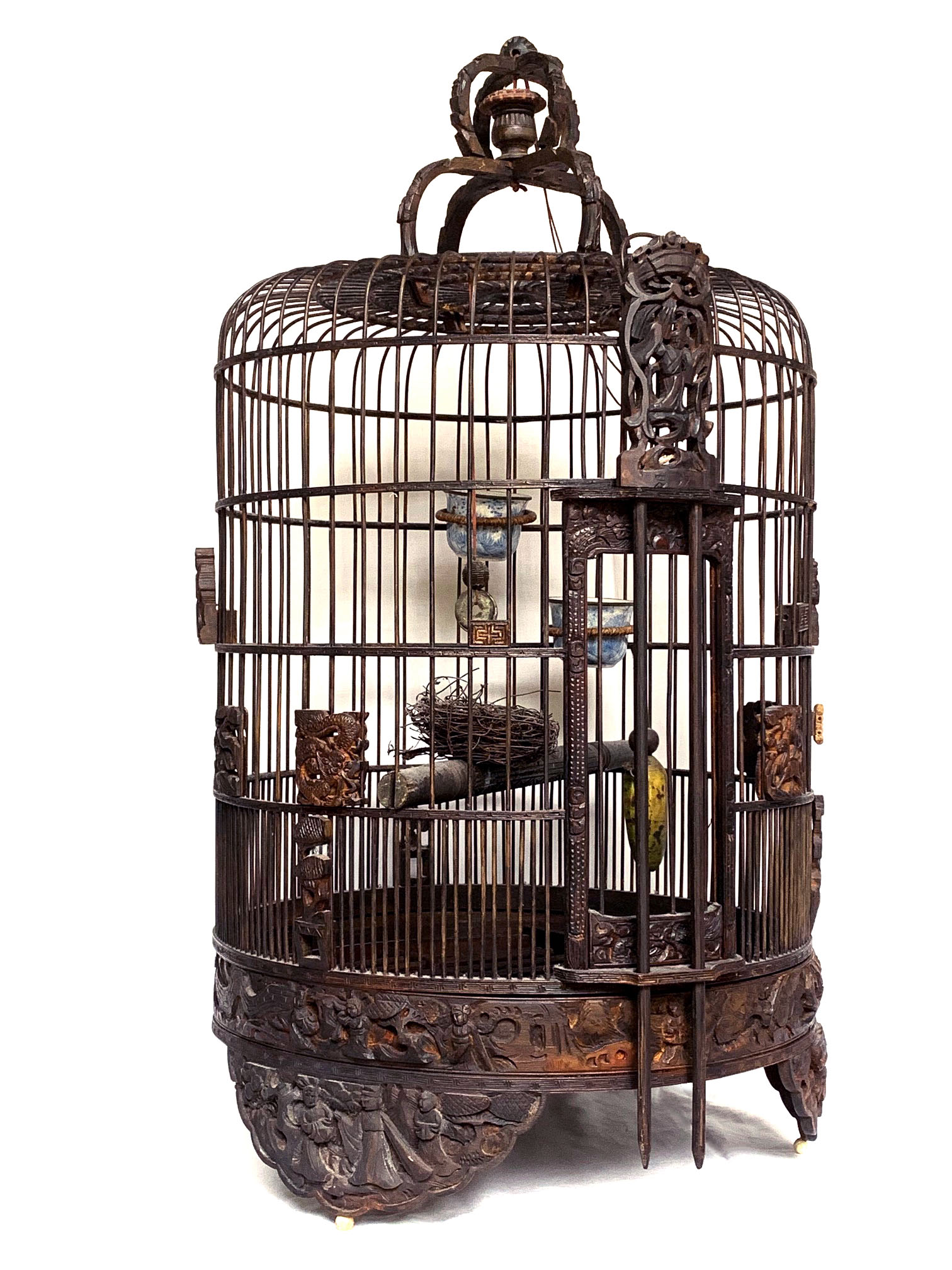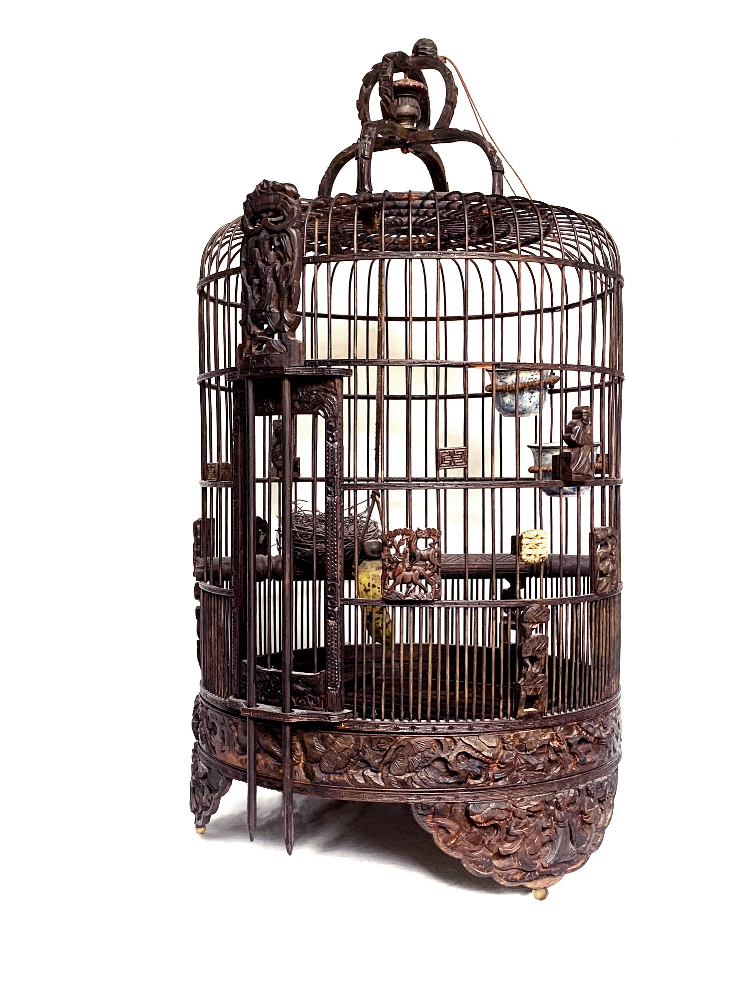 Gaiola em madeira lavrada com entalhes de flores, e frisos.
