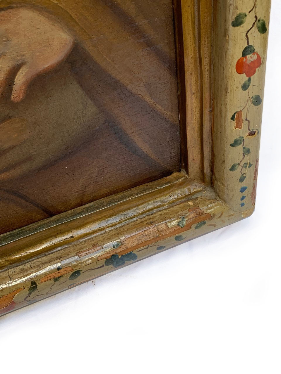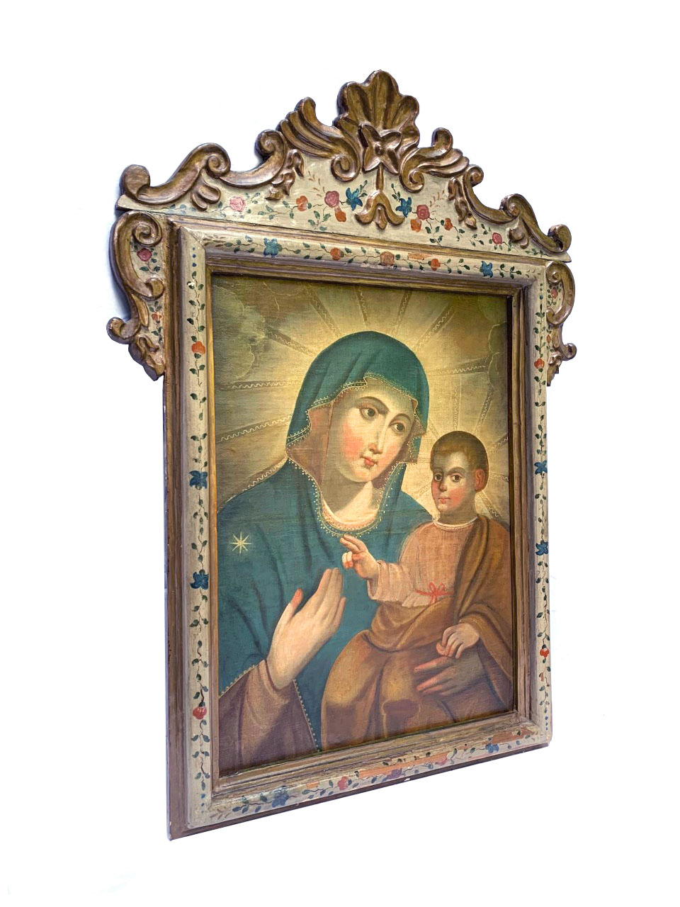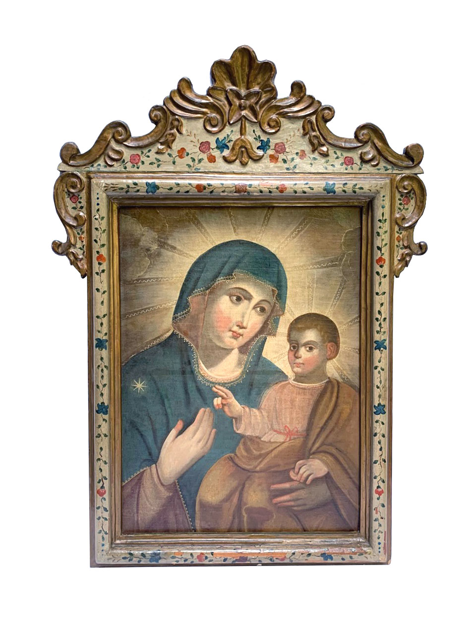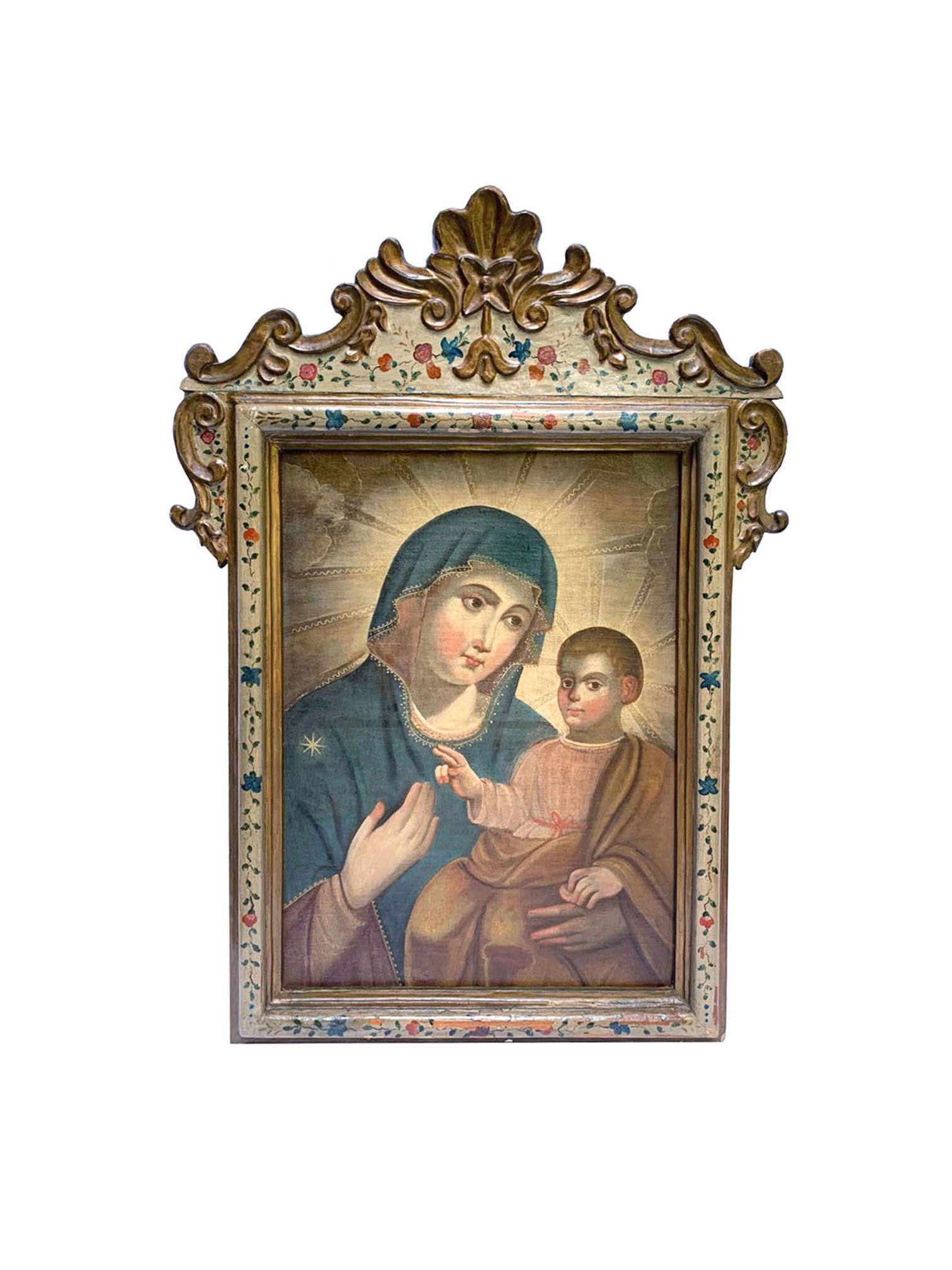 Óleo sobre tela retratando Madonna com o Menino. Moldura em madeira entalhada, dourada e policromada com arranjos florais.