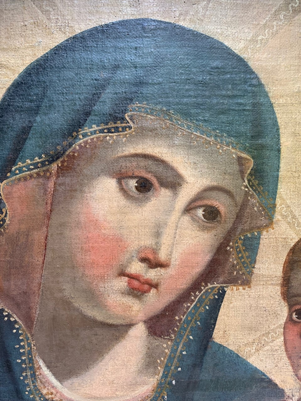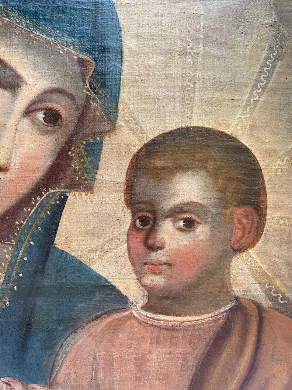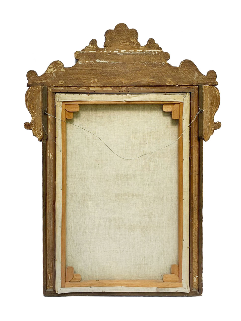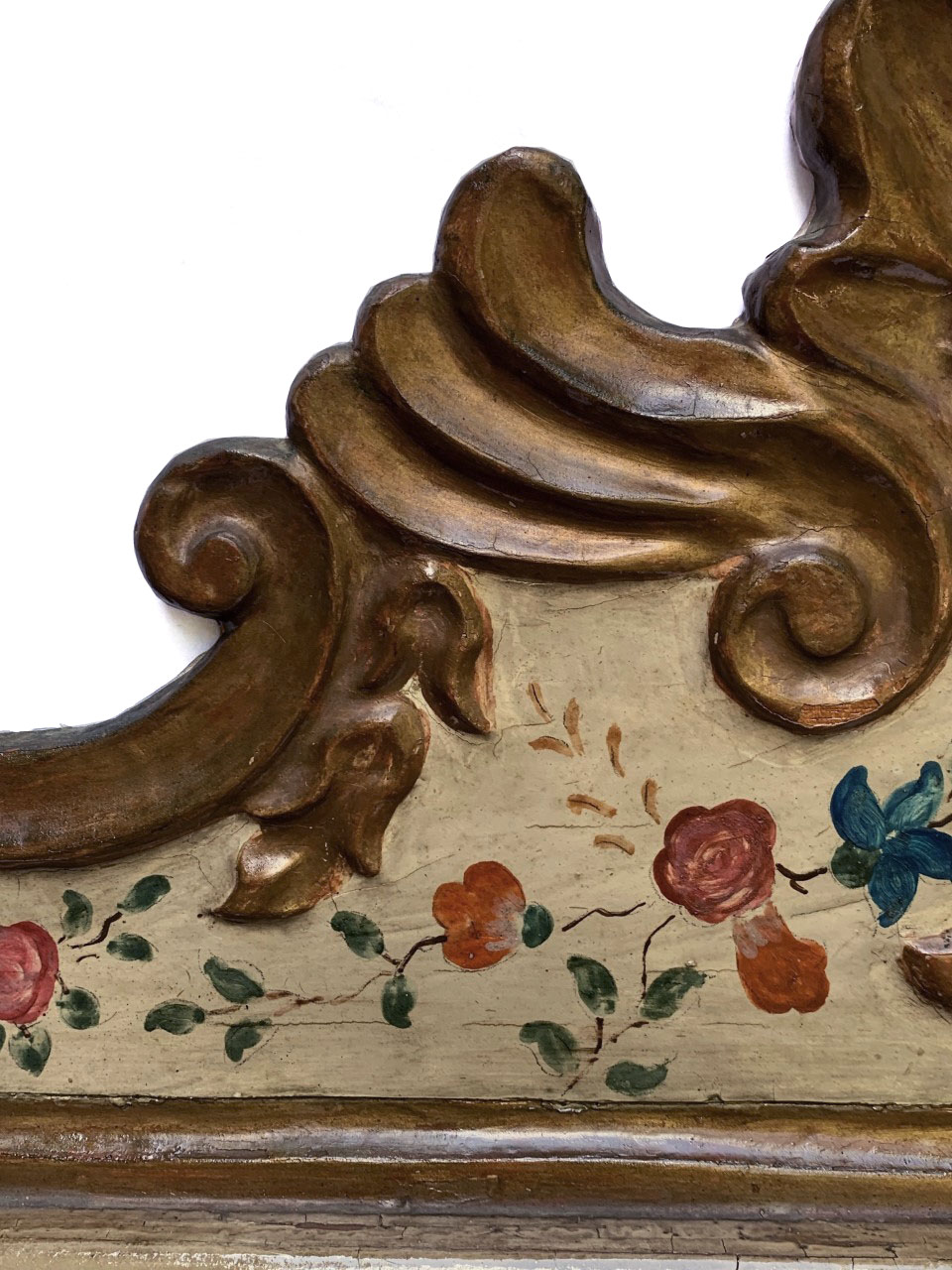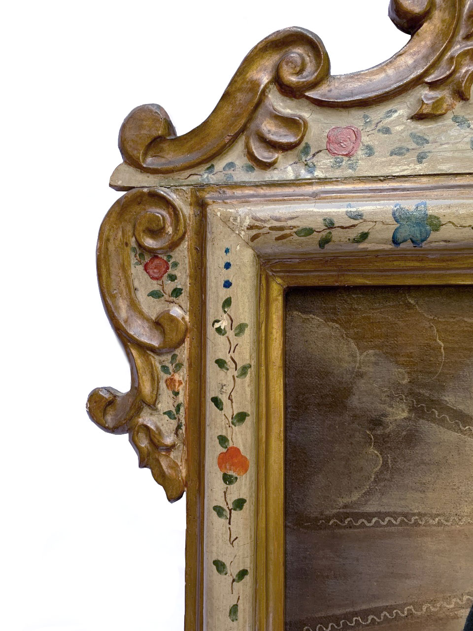 Óleo sobre tela retratando Madonna com o Menino. Moldura em madeira entalhada, dourada e policromada com arranjos florais.