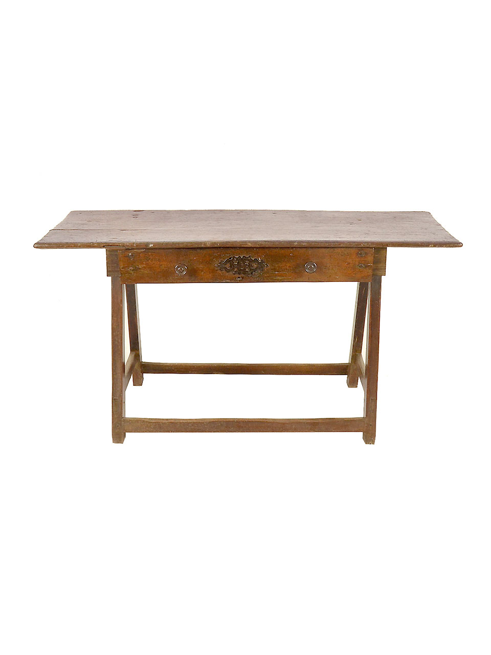 Mesa cavalete em vinhático. Tampo retangular, caixa com gaveta única de puxadores torneados centralizados por espelho de fechadura em ferro. Perna em cavalete.