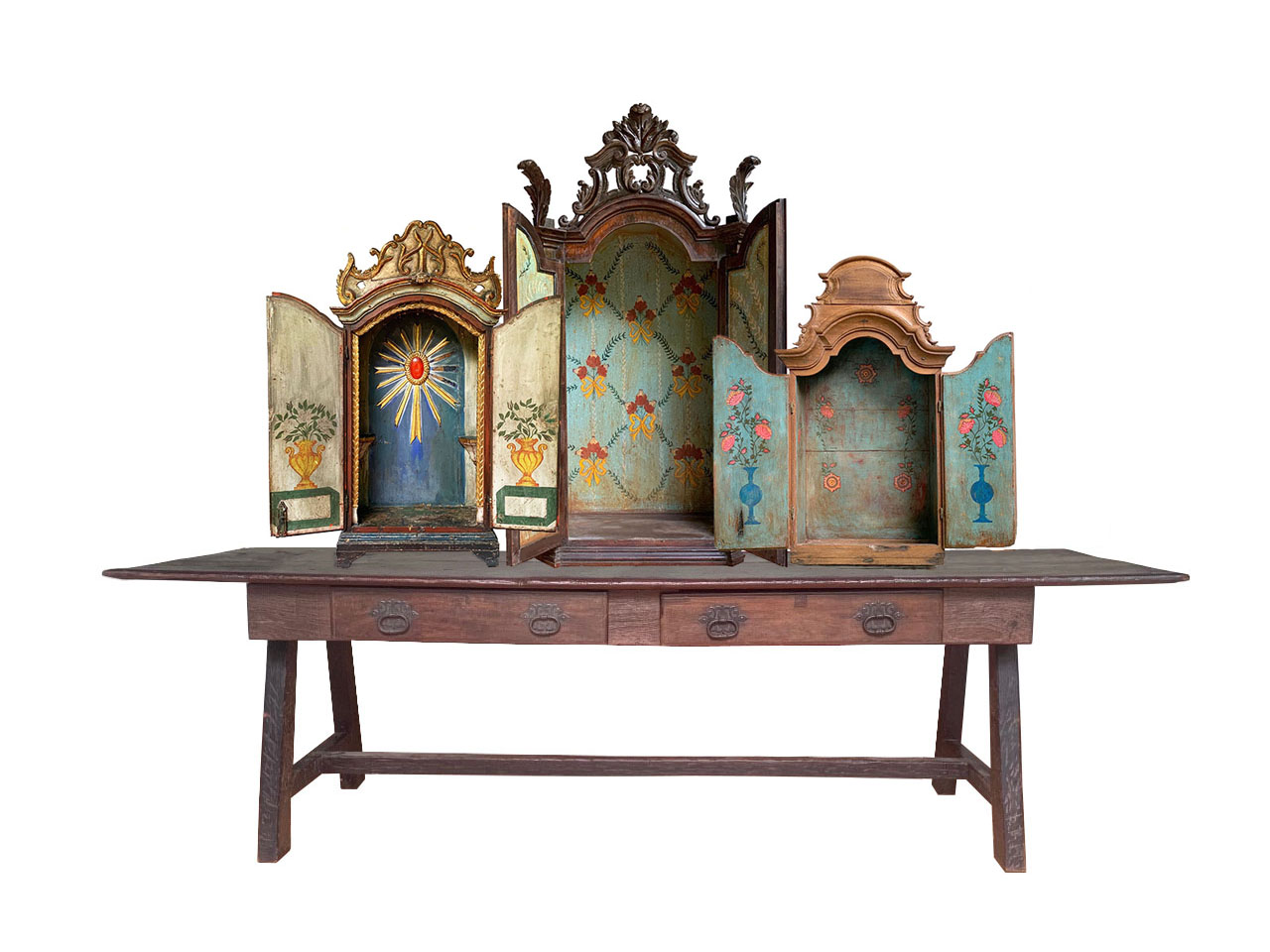 Mesa cavalete em jacarandá e vinhático. Tampo retangular, formado por duas tábuas, sobre caixa lisa composta por par de gavetões alinhados, guarnecidos por puxadores em ferro forjado. Pernas formando cavaletes, reunidas por travessão.