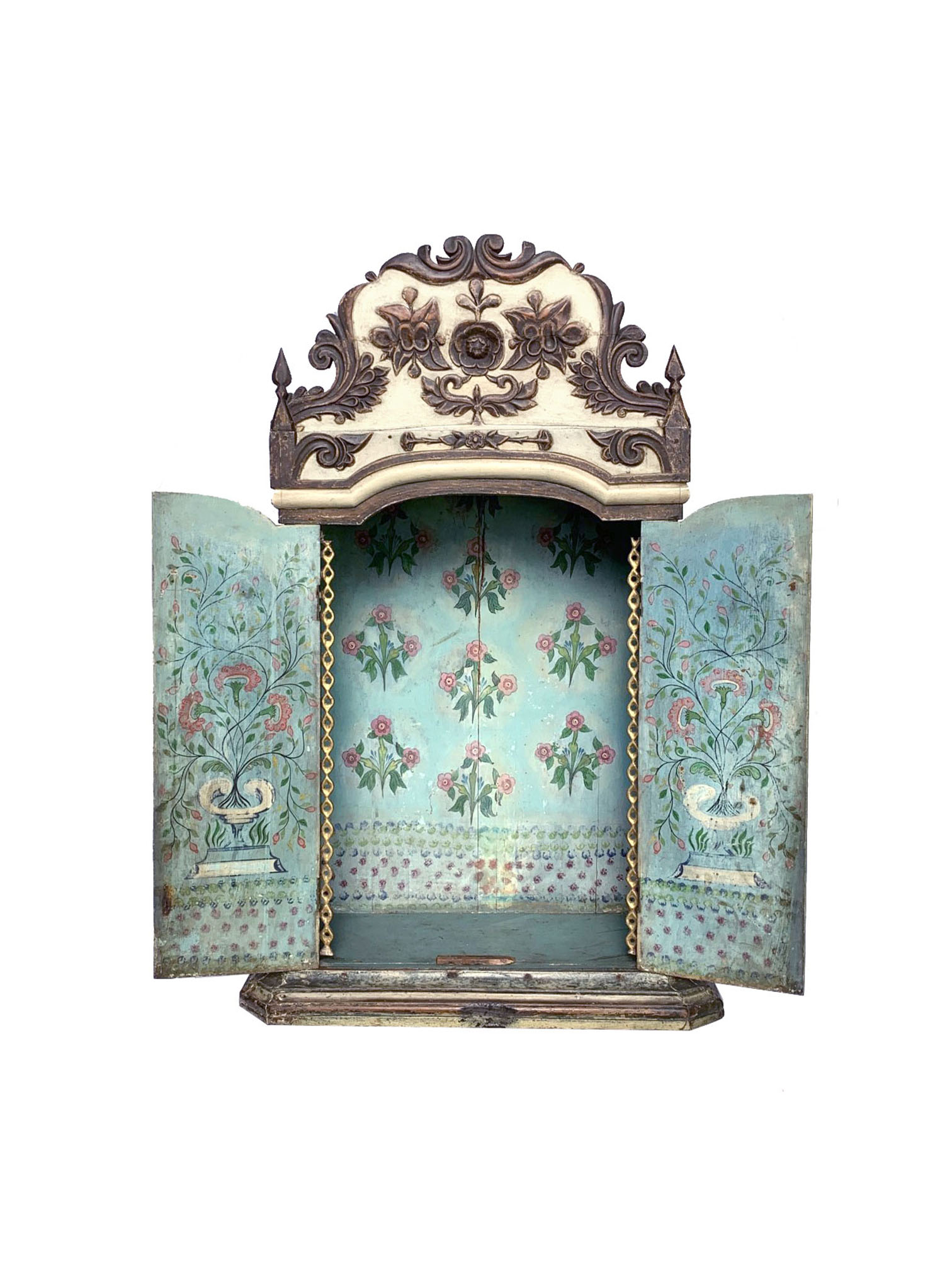 Oratório em cedro policromado. Caixa retangular, encimada por frontão recortado e entalhado com flores, ladeado por par de ponteiras – como obeliscos simplificados. Laterais e par de portas guarnecidas por almofadas com entalhes de ramos florais. Base emoldurada. Interior de fundo azul claro, com pinturas de arranjos florais, pontilhados, e jarros nas portas.