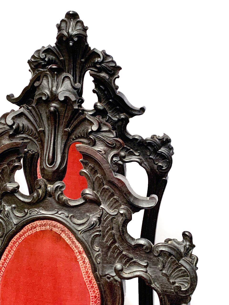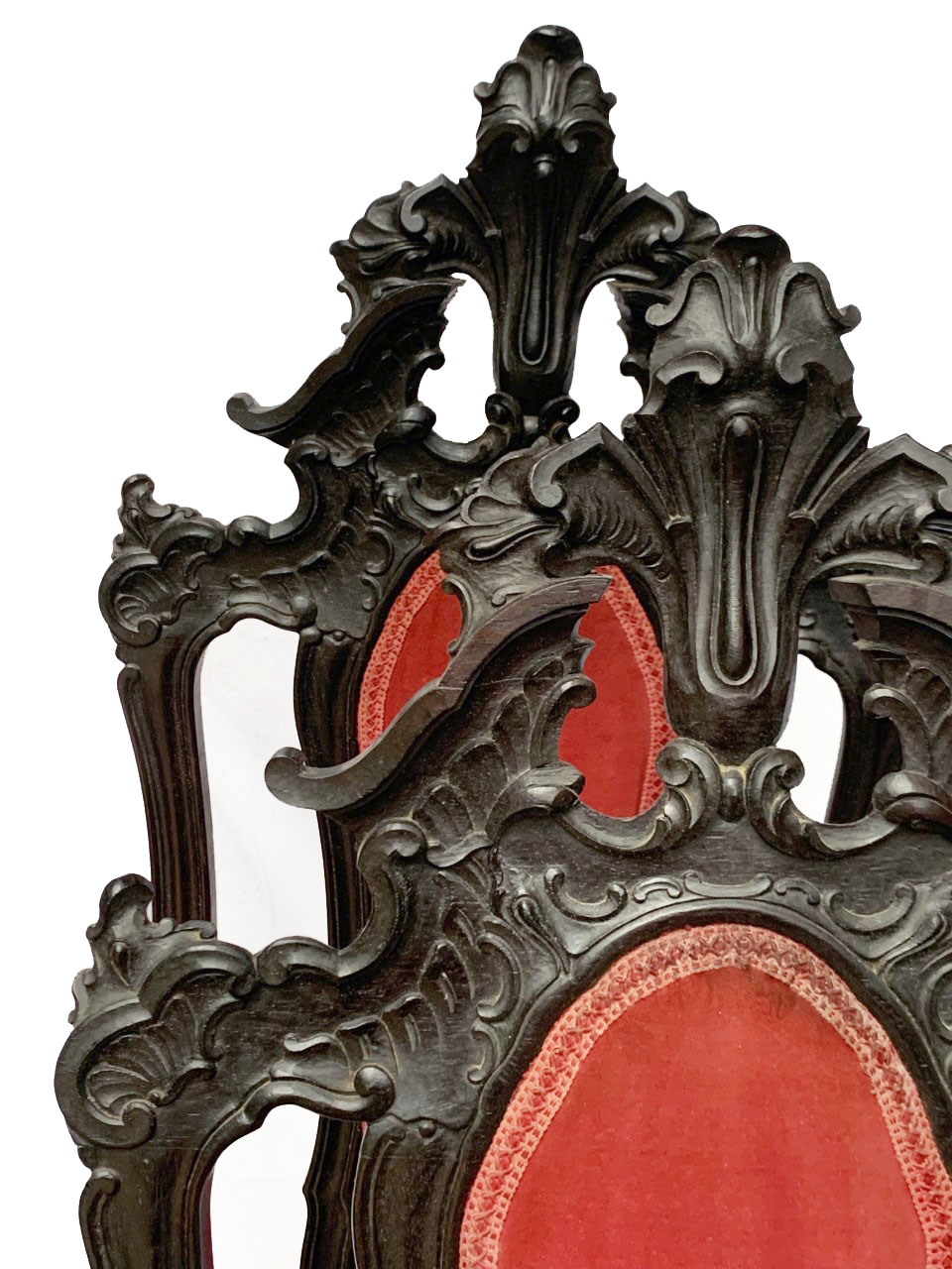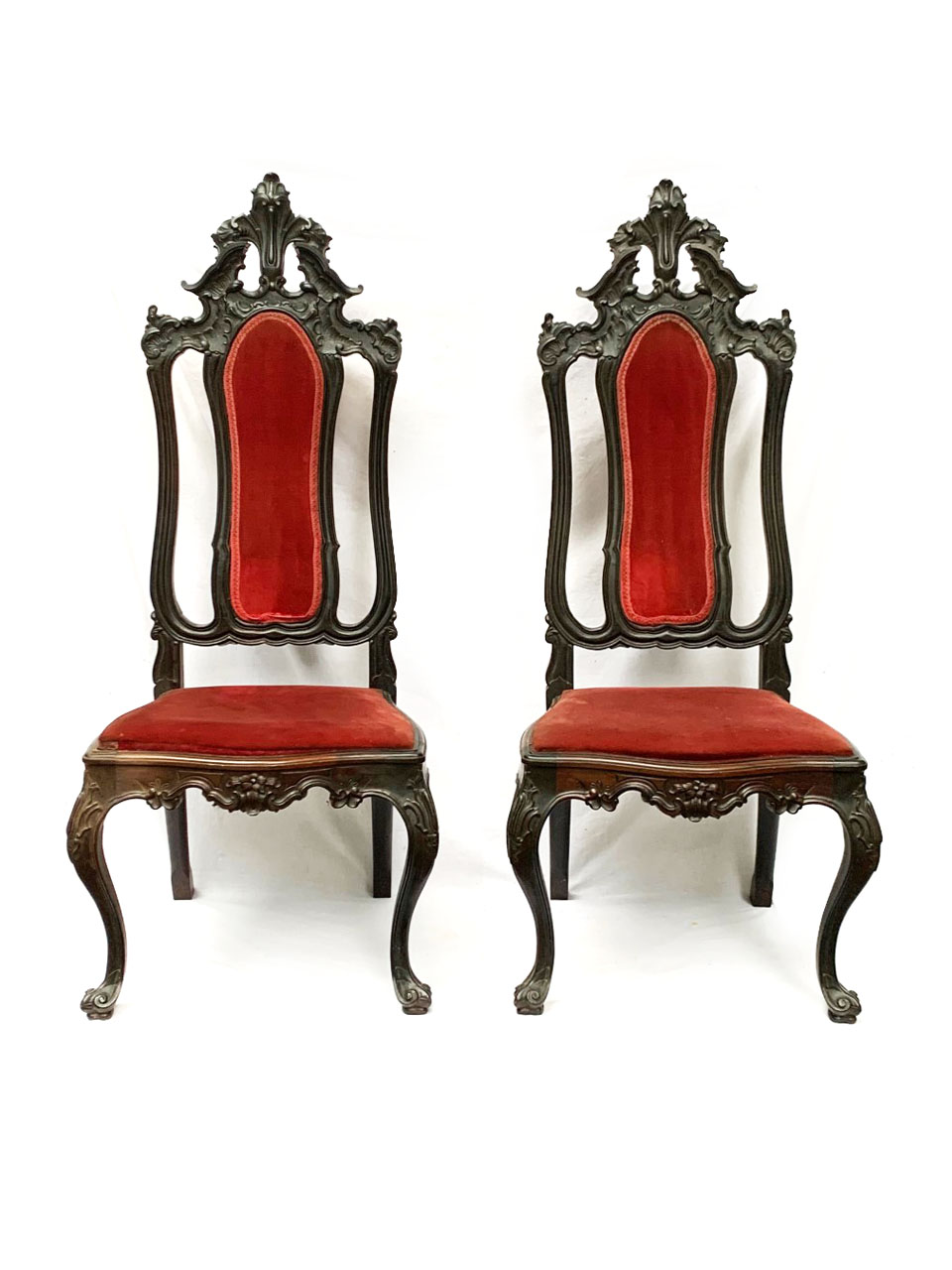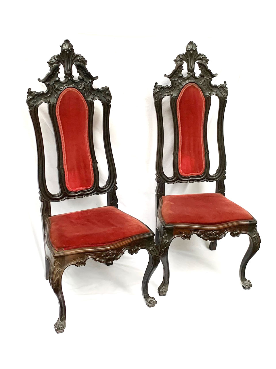 Par de cadeiras estilo Dom José I. Espaldar alto, entalhado com cartelas e volutas, centralizado por tabela estofada. Assento trapezoidal, estofado, com barra ondulada, recortada e entalhada. Pernas dianteiras arqueadas com pés terminados em volutas.
