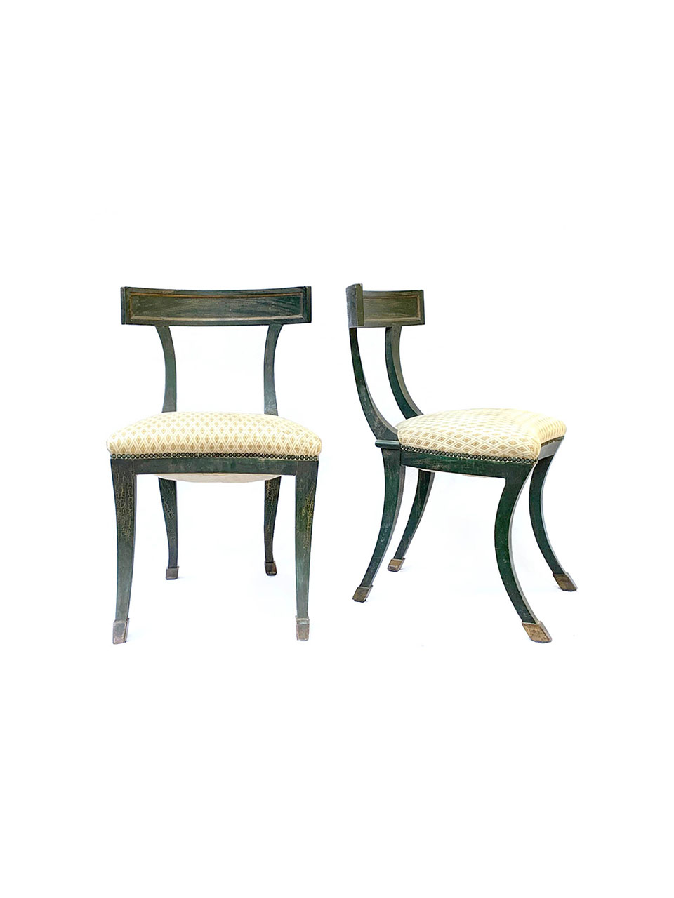 Par de cadeiras em madeira pintada e dourada no modelo clássico conhecido por Klismos. Espaldares arqueados, assentos estofados e pernas em curvas.