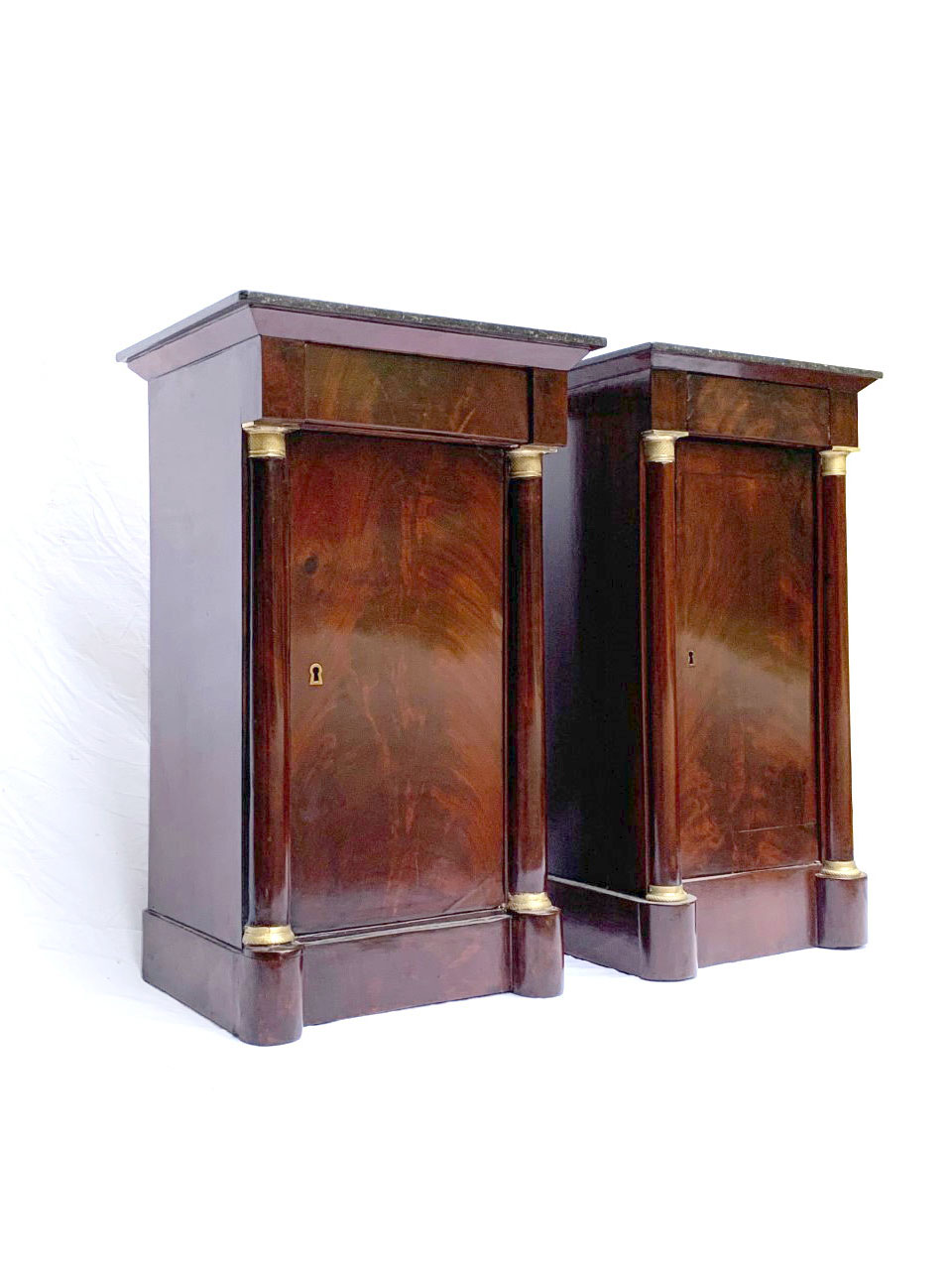 Par de criados, com pequena diferença na altura, em pluma de mogno. Caixa retangular, tampo em mármore esverdeado, escuro, contornado abaixo por friso. Portas ladeadas por colunetas, sob gavetinha, guarnições em bronze. Prateleiras no interior em pedra e madeira.