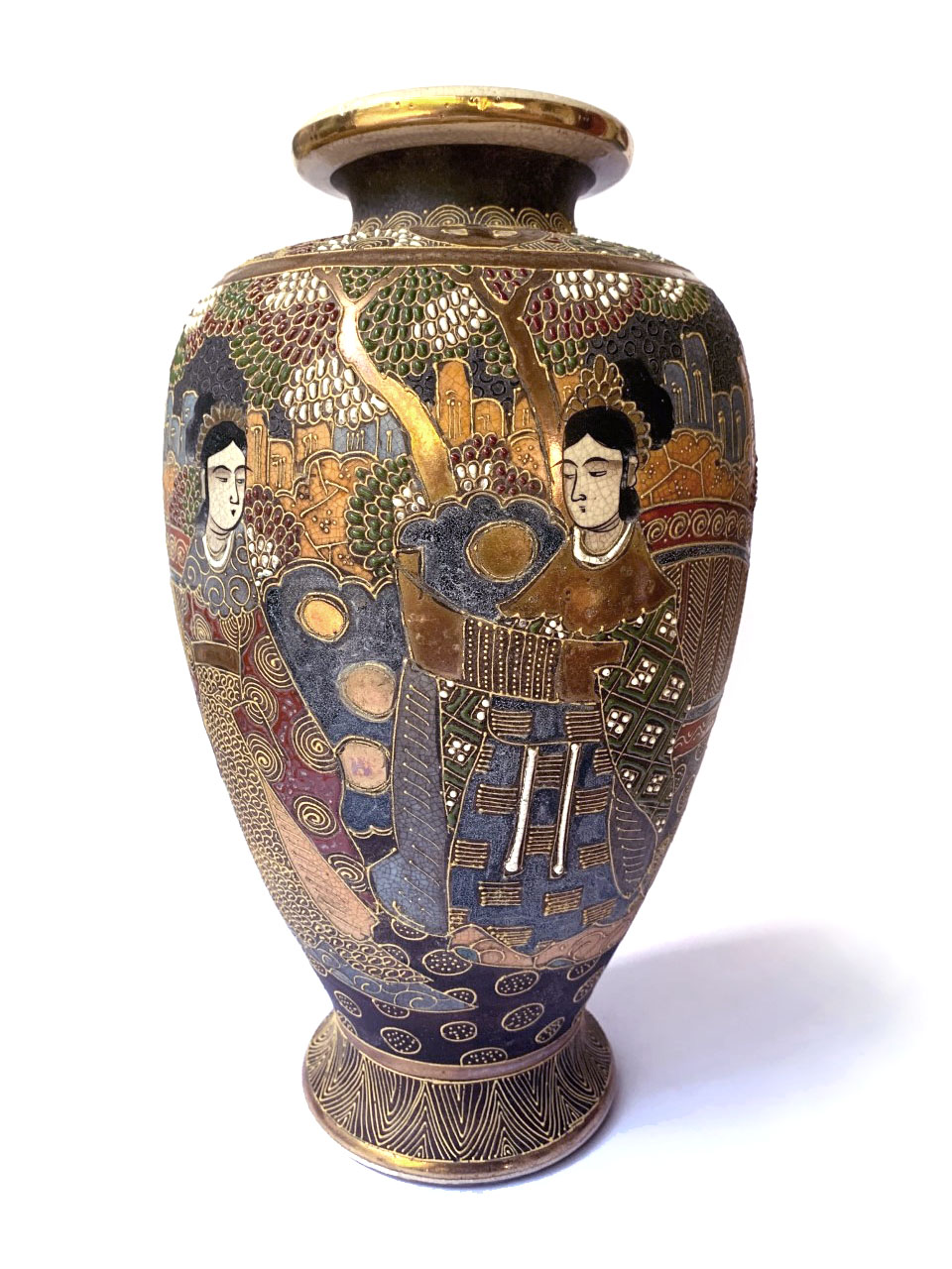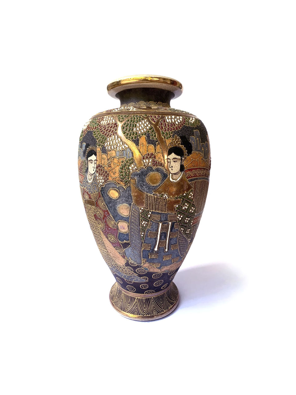 Vaso Satsuma em cerâmica esmaltada e relevada. Apresenta exótica decoração mostrando duas princesas em cena com atendentes. Marcado no verso da base.